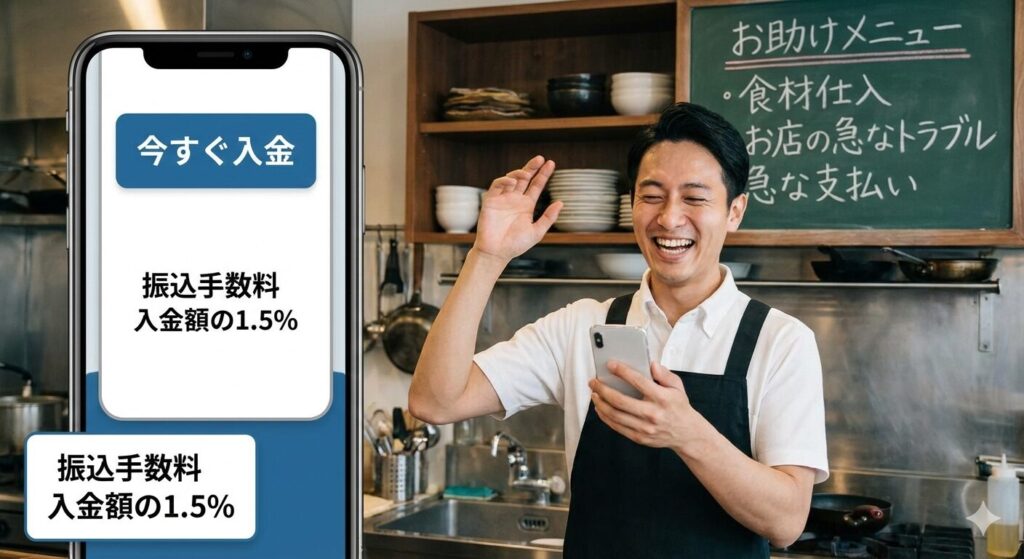 『今すぐ入金』ボタンを押すだけで、売上金が登録銀行に今すぐ振り込まれるサービス